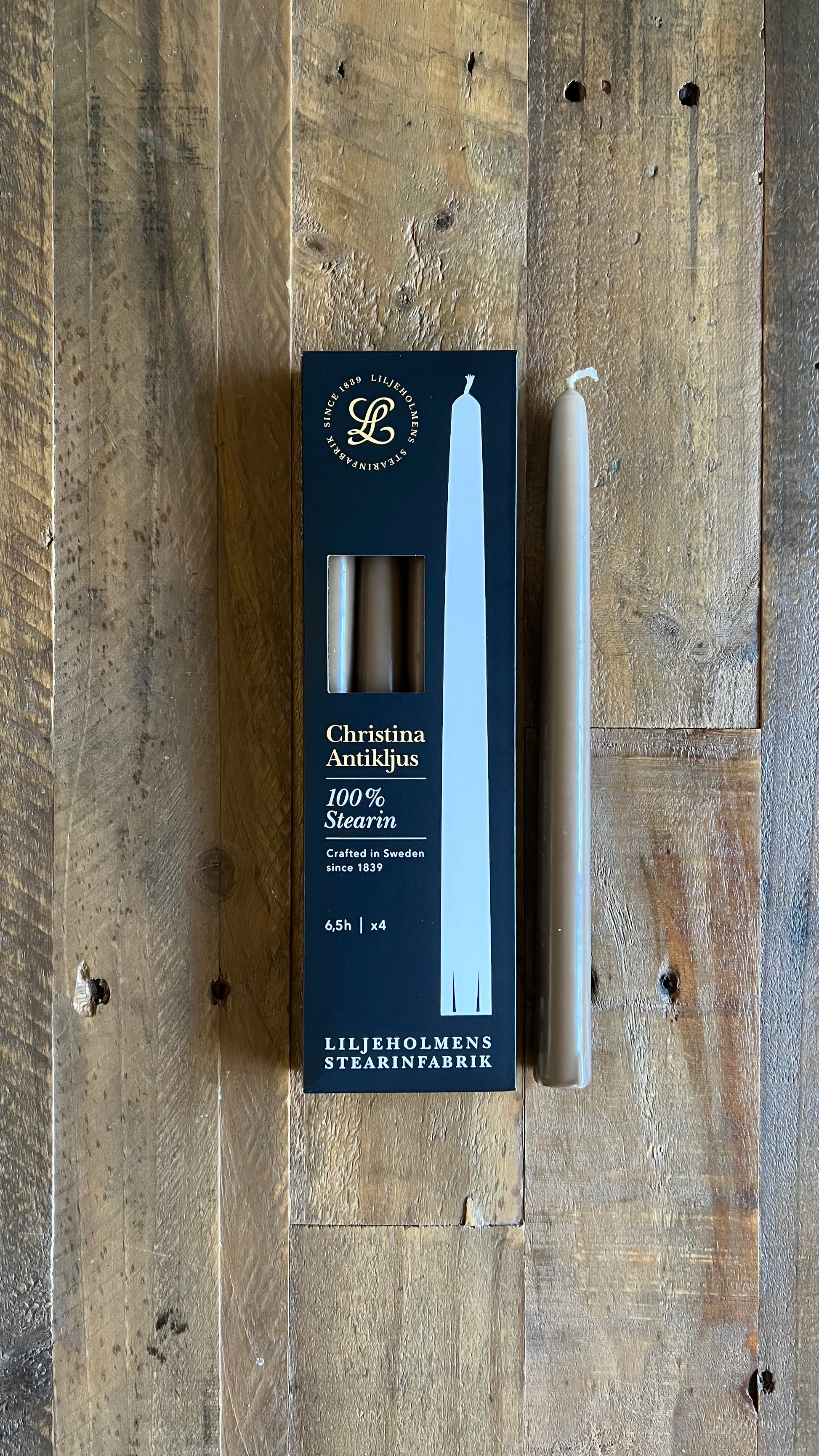 Vackert och klassiskt Christina Antikljus från Liljeholmens, tillverkat i 100 % stearin. Denna förpackning innehåller 4 stycken ljus i den vackert bruna färgen Nougat.