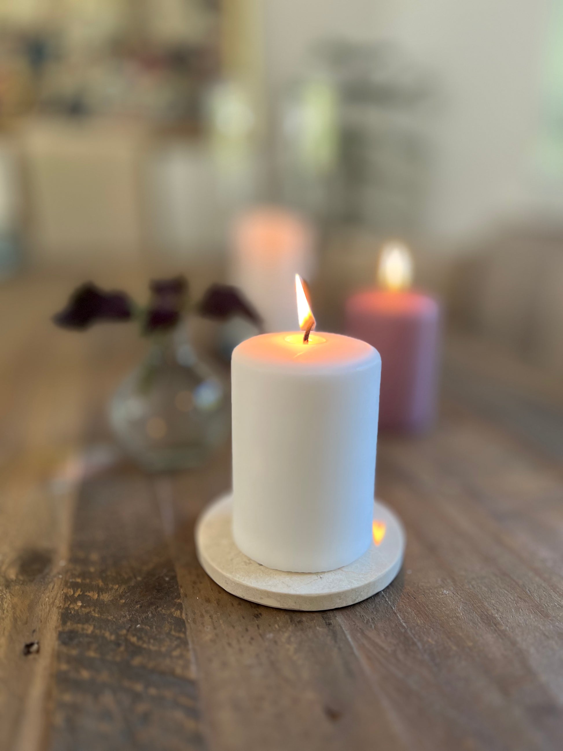 Blockljus tillverkat i 100 % stearin i färgen, Vit. Passar utmärkt att placera på fat och i större ljuslyktor inomhus.