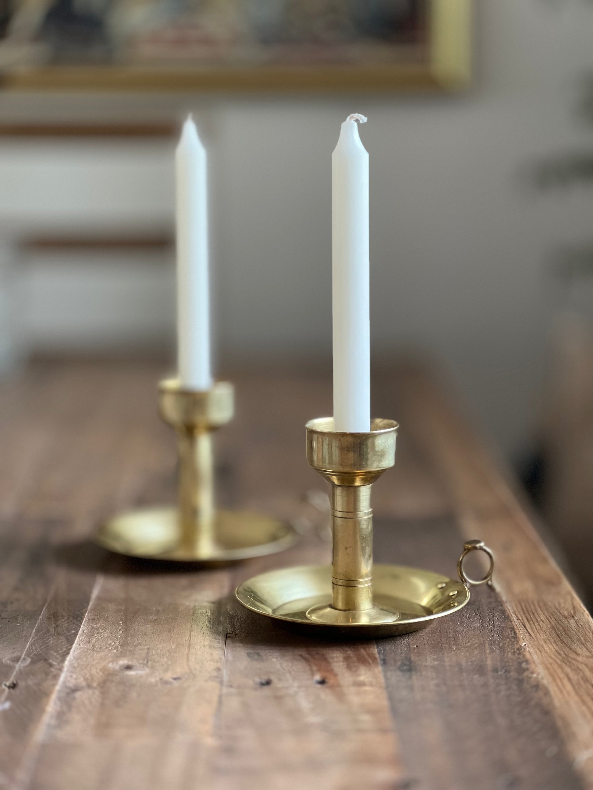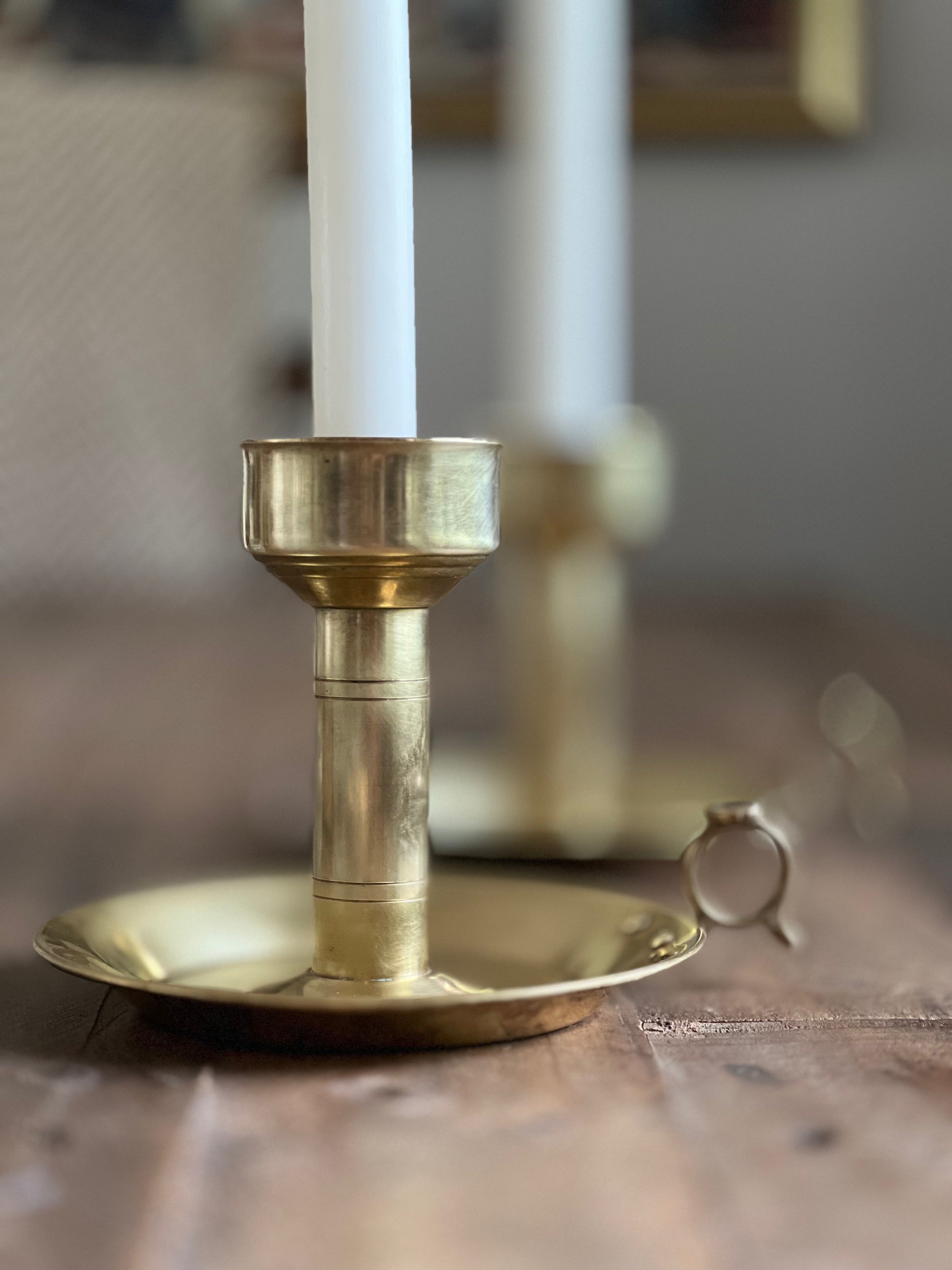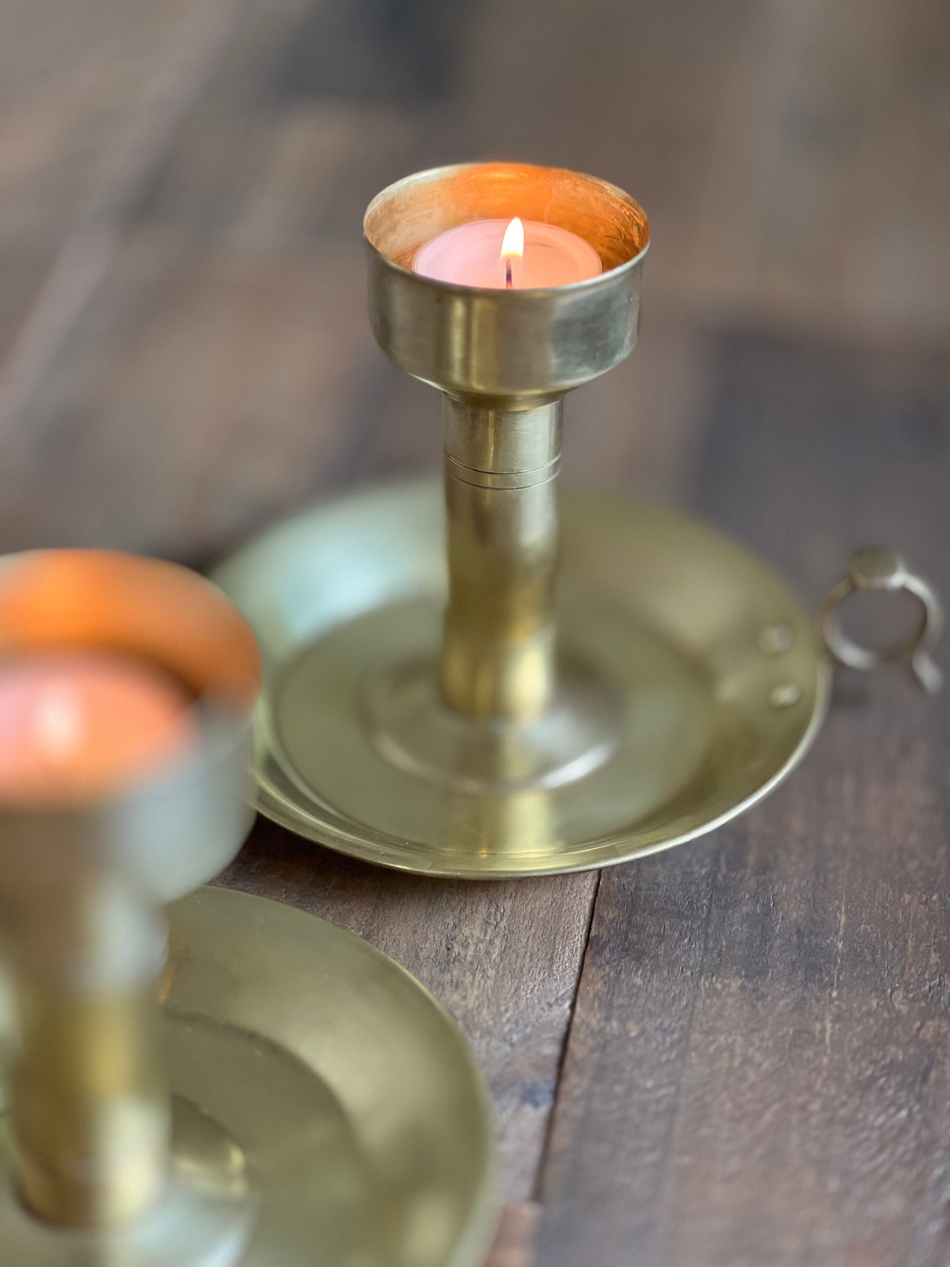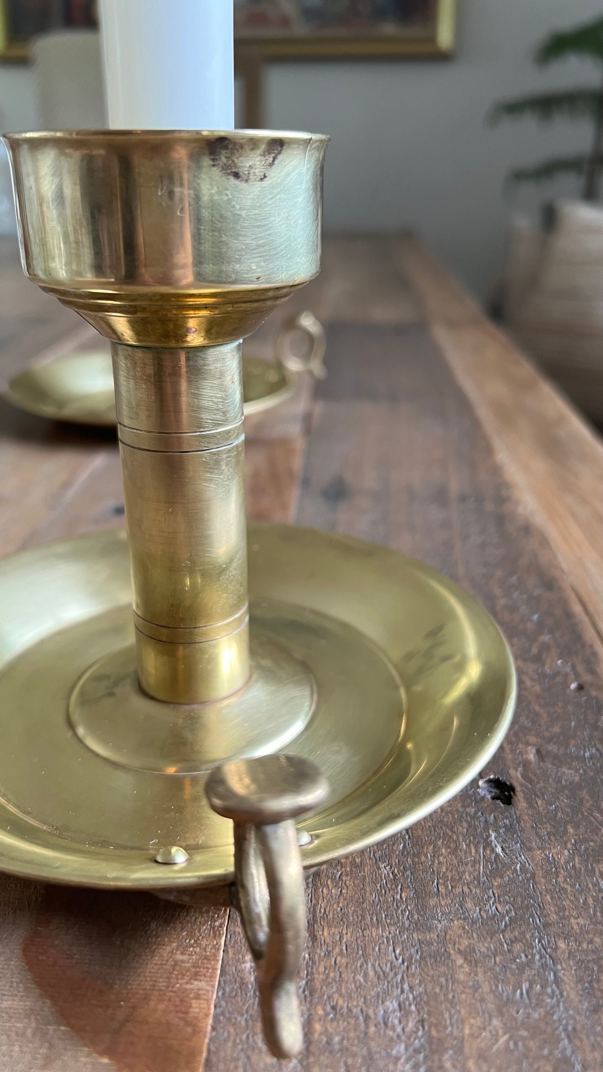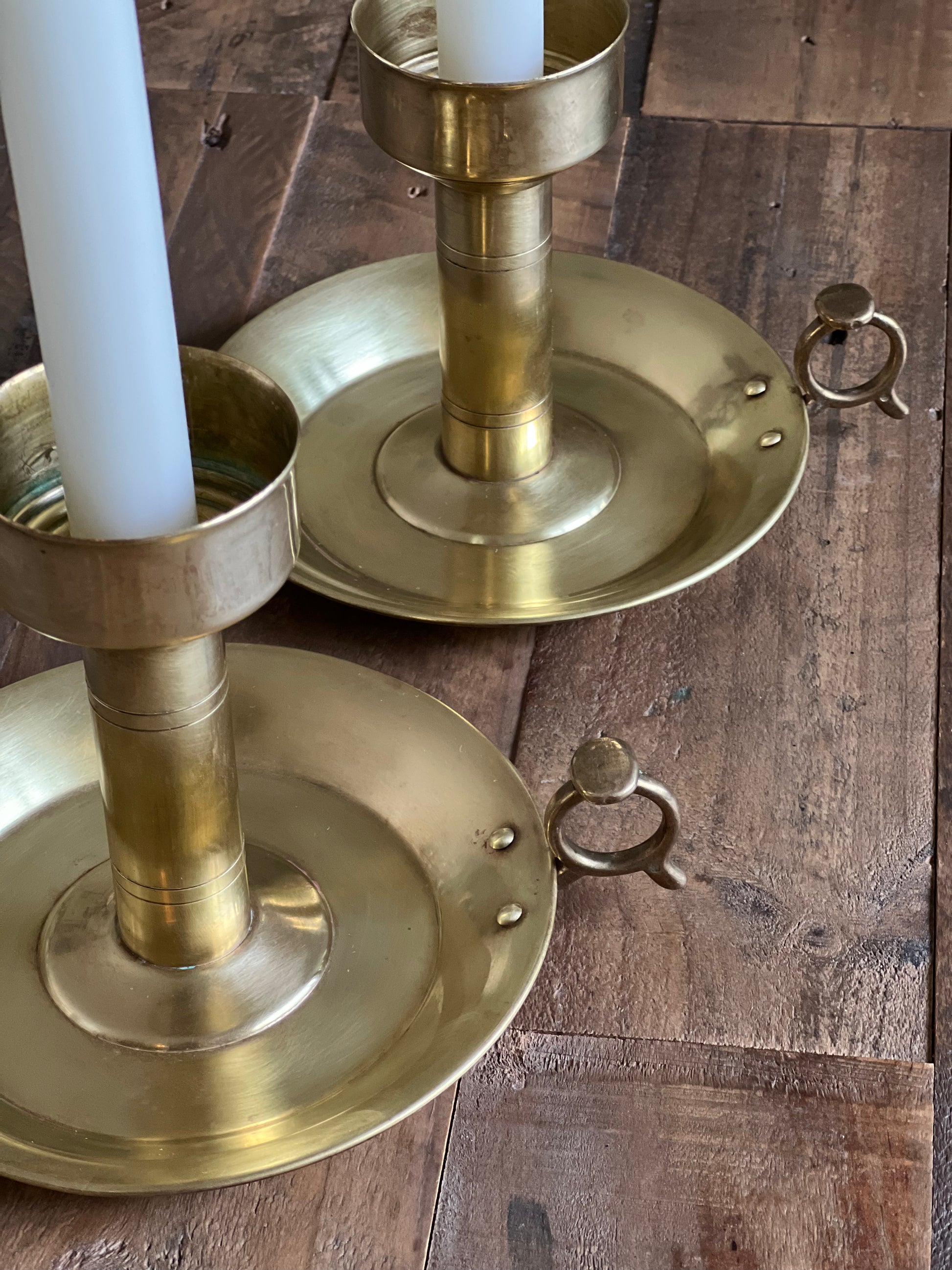 Ett par ljusstakar som utstrålar en charmig patina som bara tiden kan ge. Mässingen har mörknat något med åren på sina ställen, vilket ger ljusstakarna en vacker antik känsla. Små repor och några fläckar vittnar om ett liv fyllt av stunder och minnen. Med sin tidlösa design har dessa stakar fortfarande mycket kvar att ge.