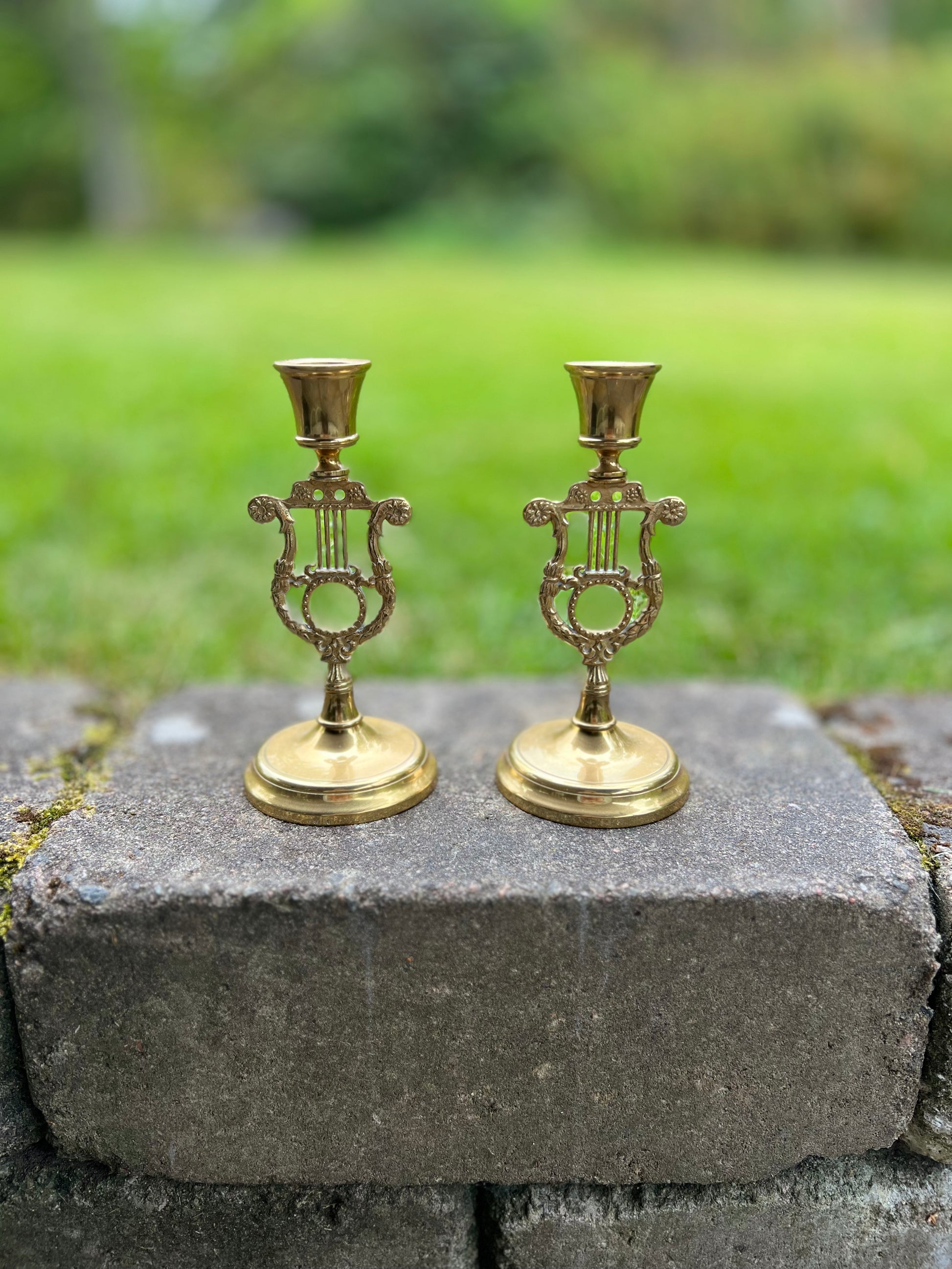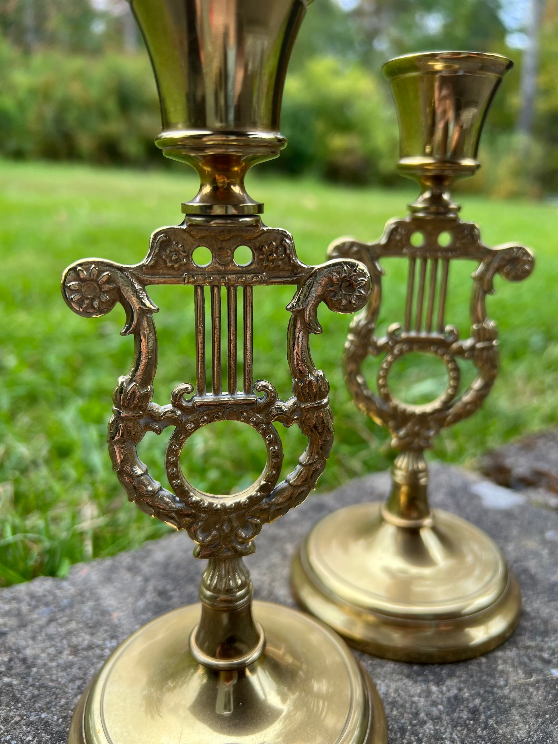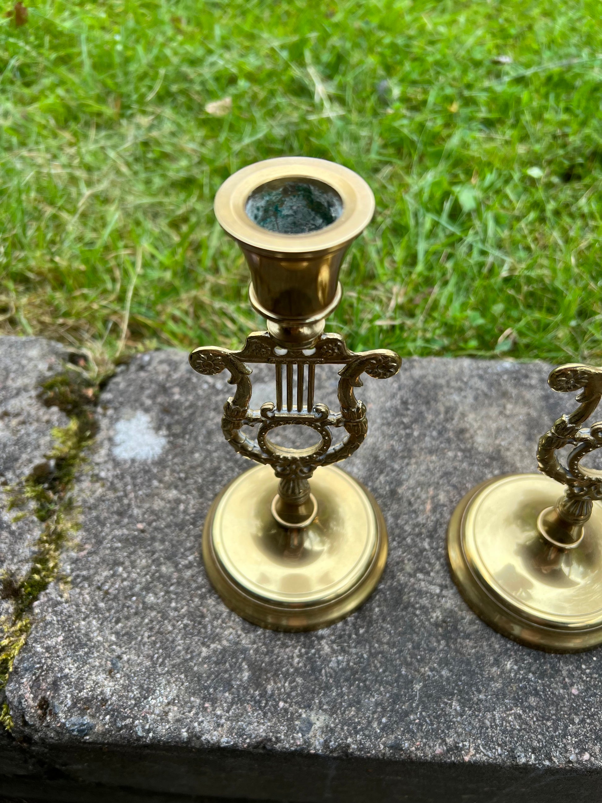 Två eleganta ljusstakar från Skultuna i lyrmodell.