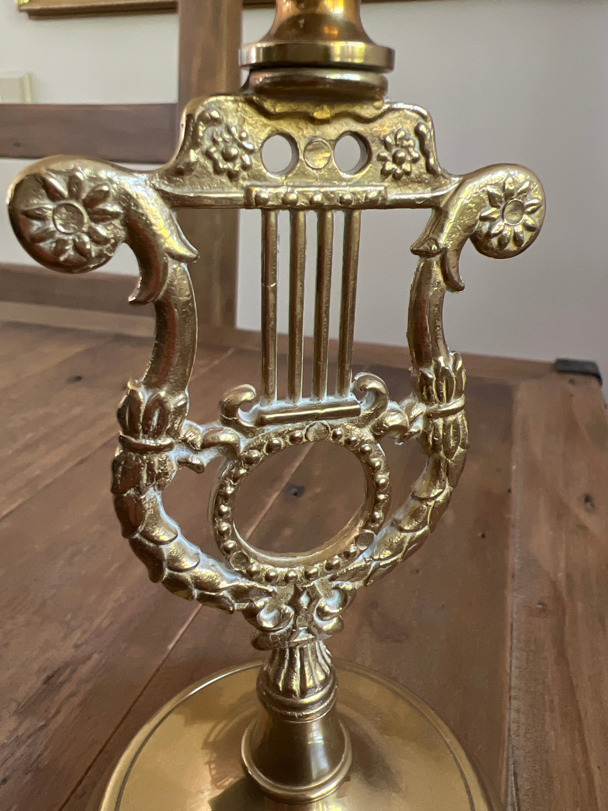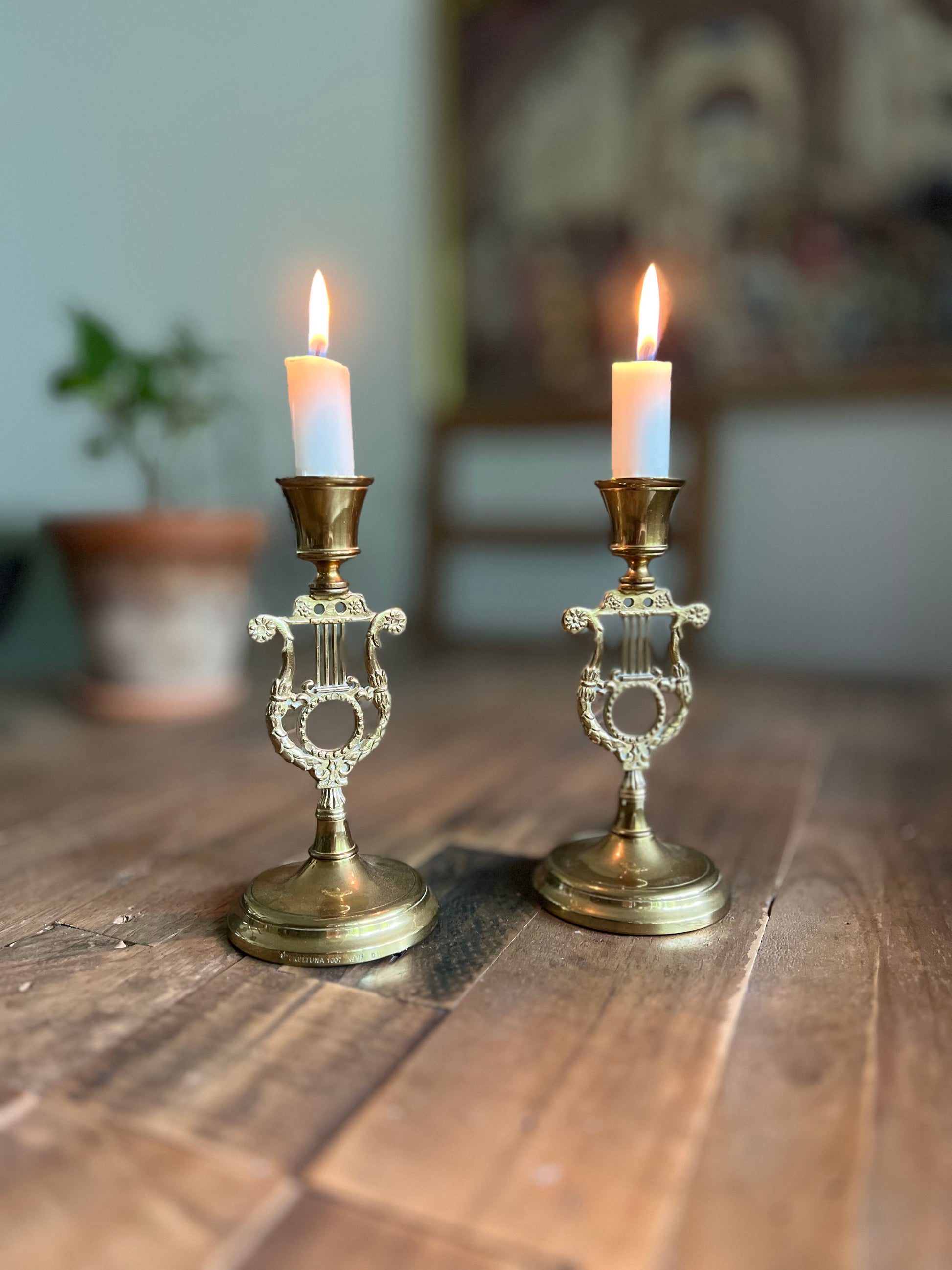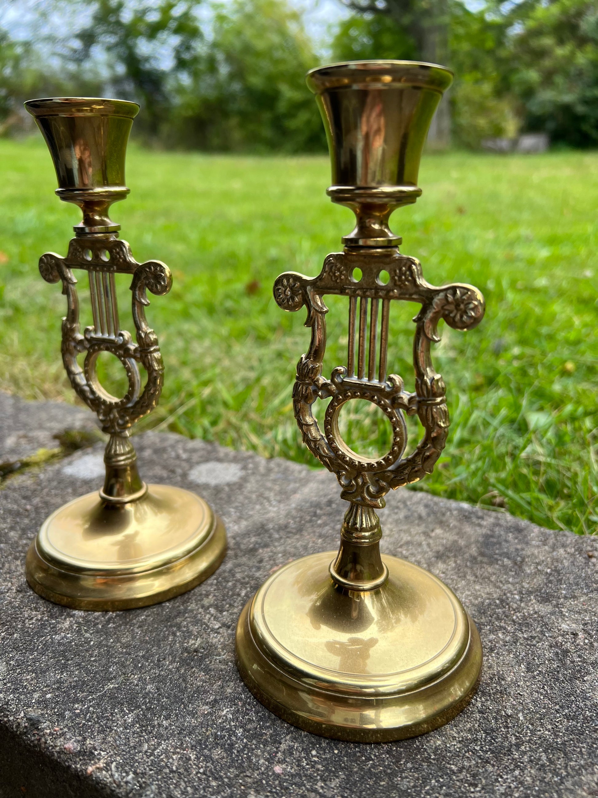 Två eleganta ljusstakar från Skultuna i lyrmodell.
