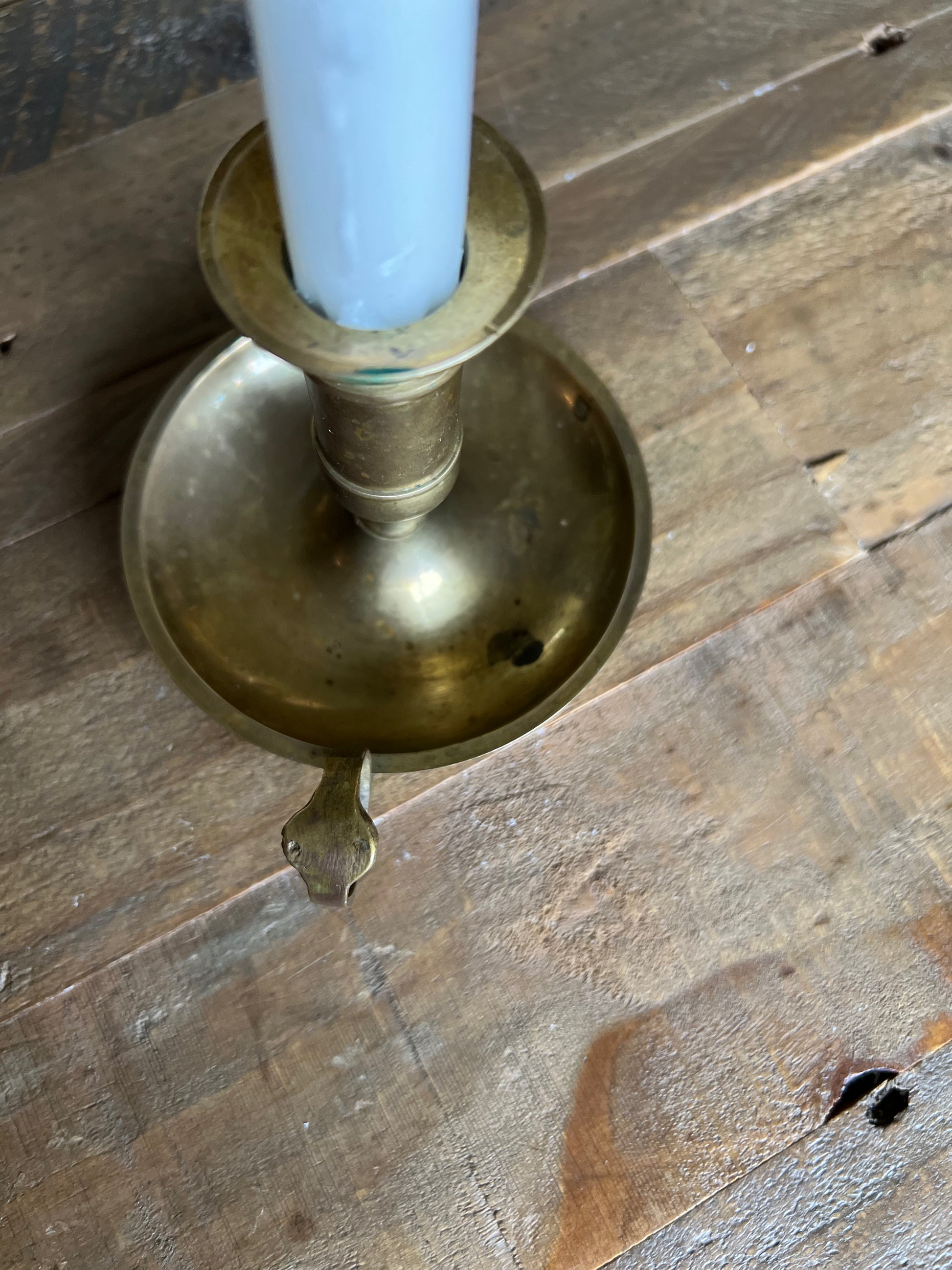 En mindre ljusstake i mässing. Dess naturliga patina vittnar om historia och skapar charm samt karaktär.