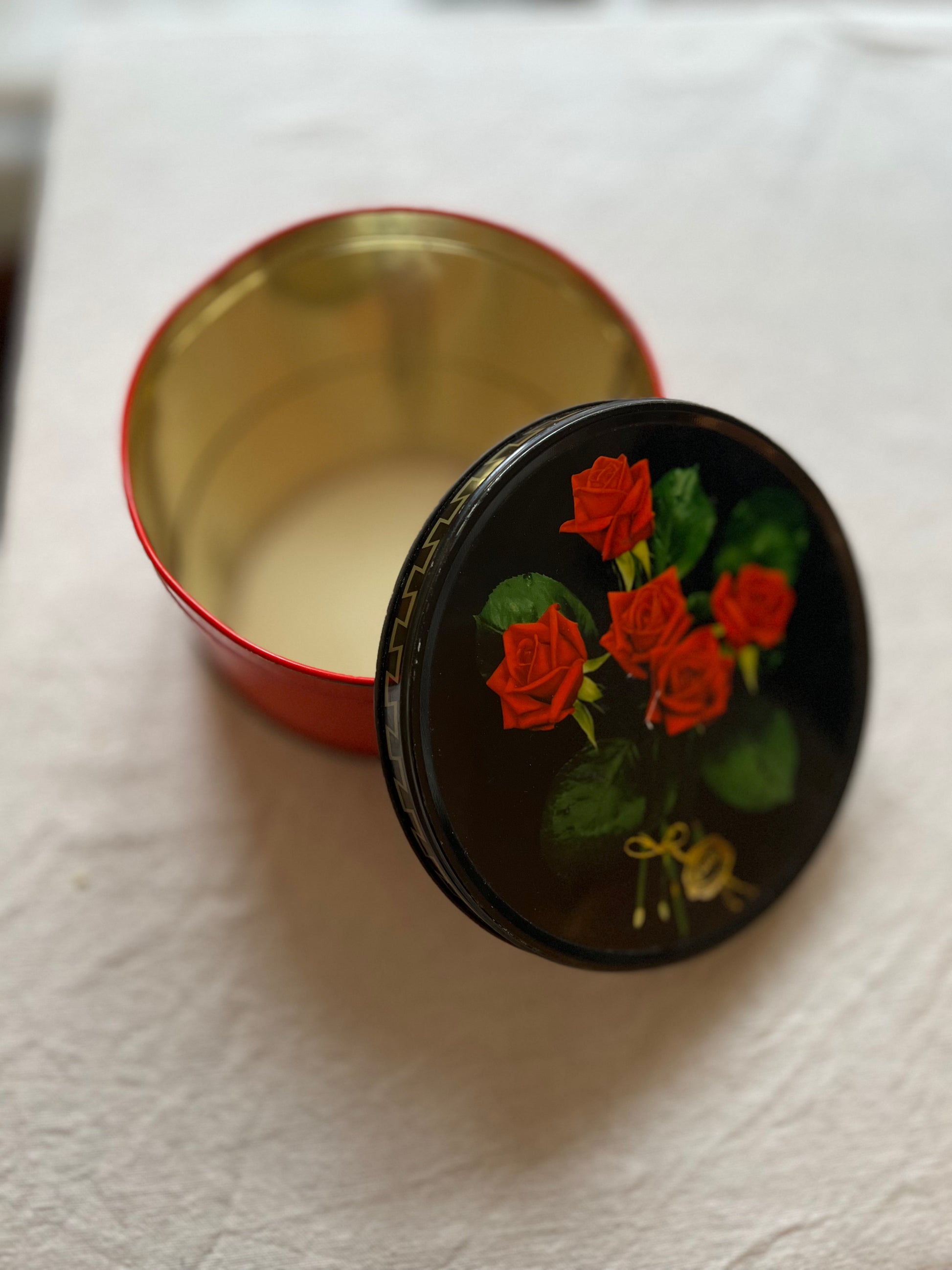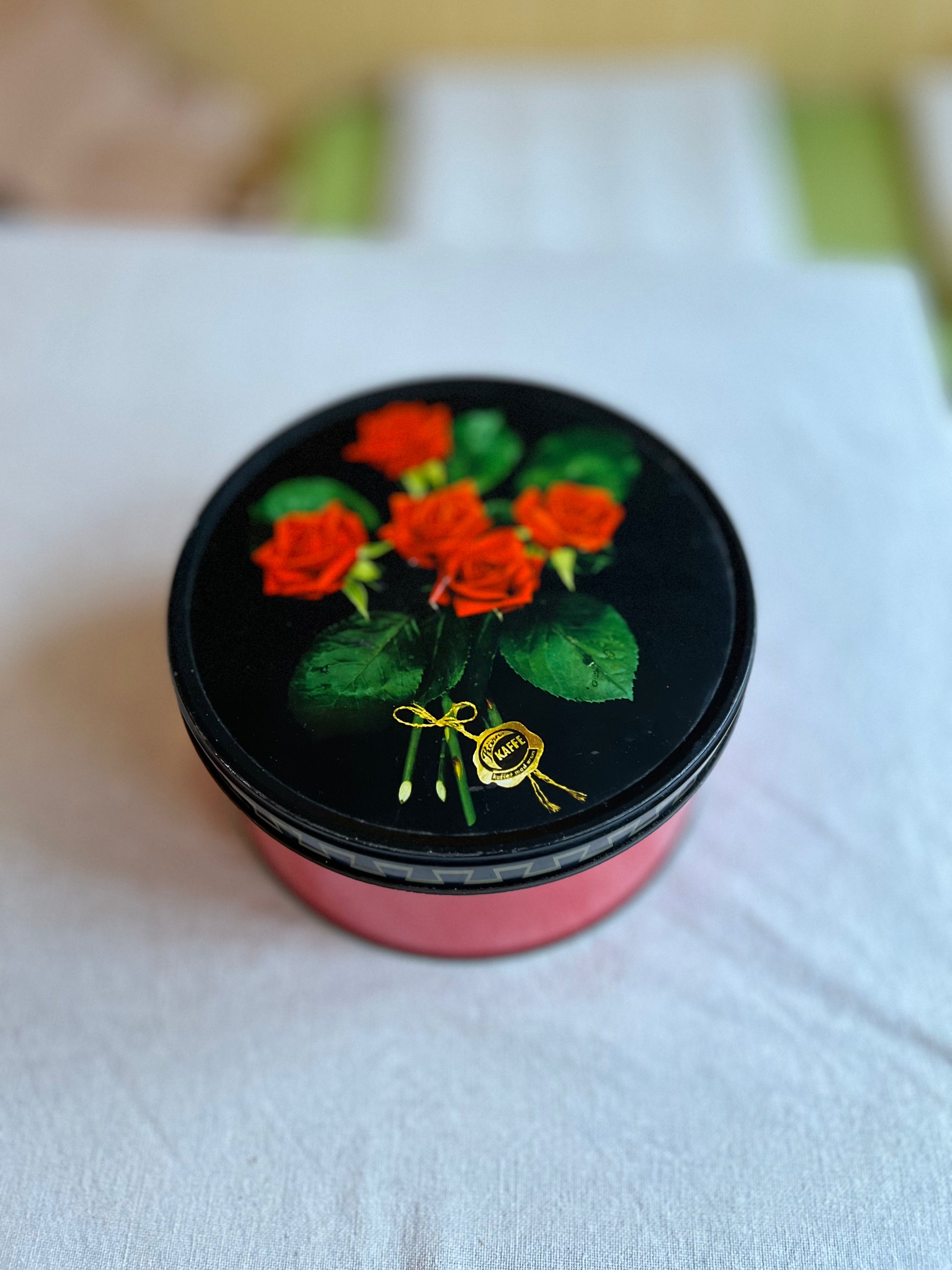 En plåtburk i original från Kärn Kaffe. Burken har ett vackert blomstermotiv och naturlig patina.