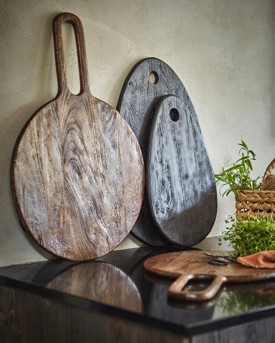 Svart skärbräda gjord av mangoträd.