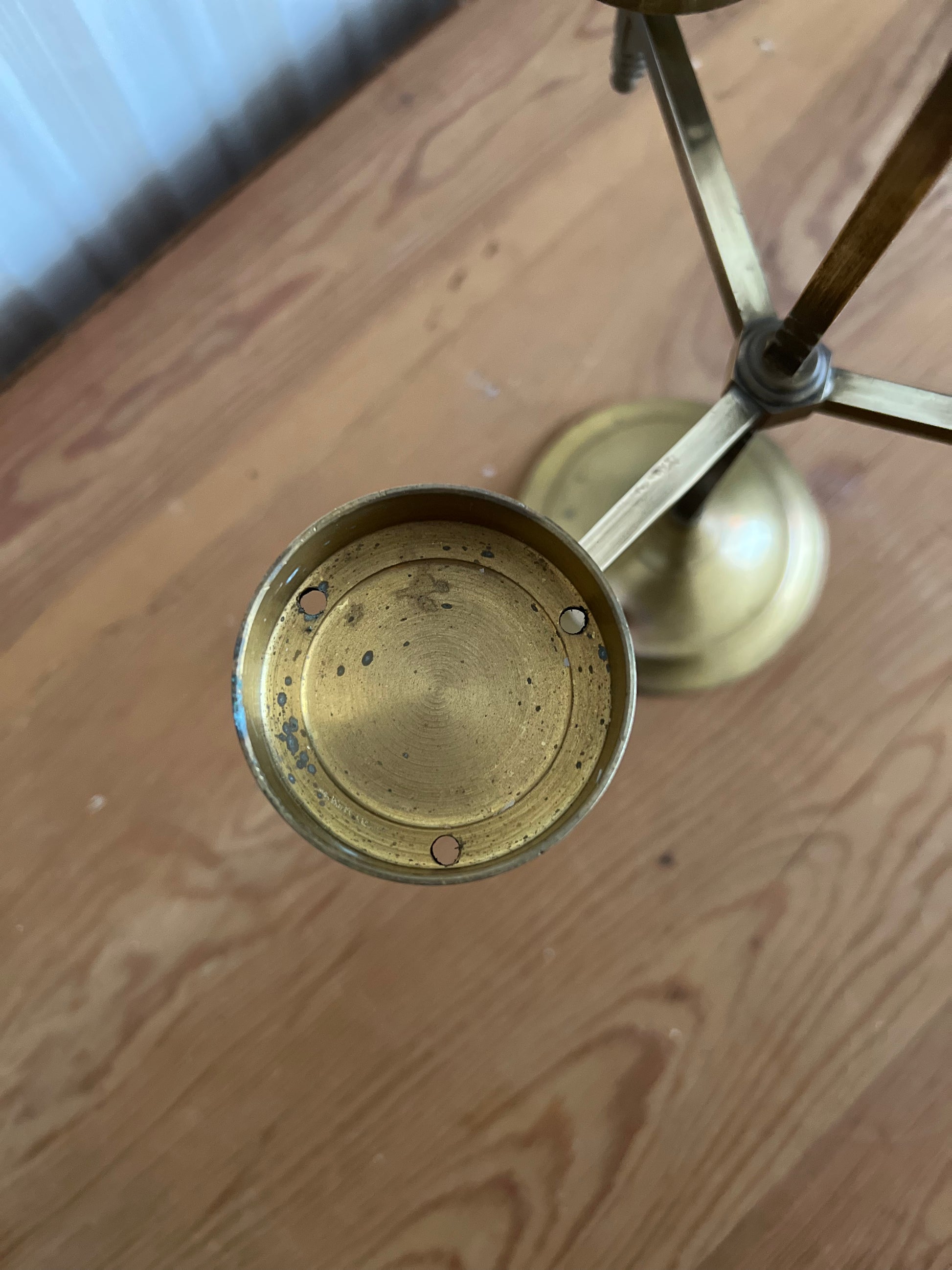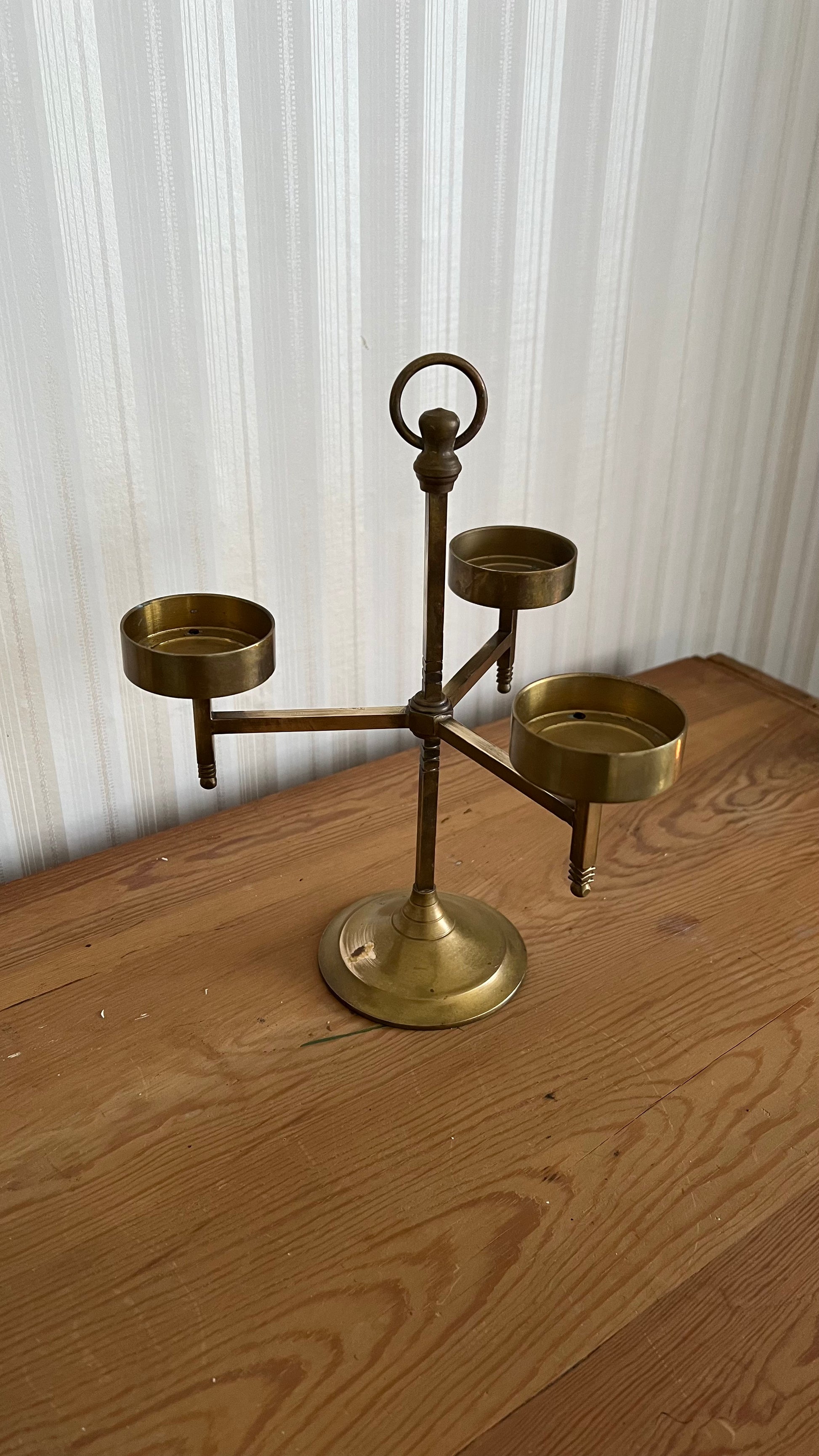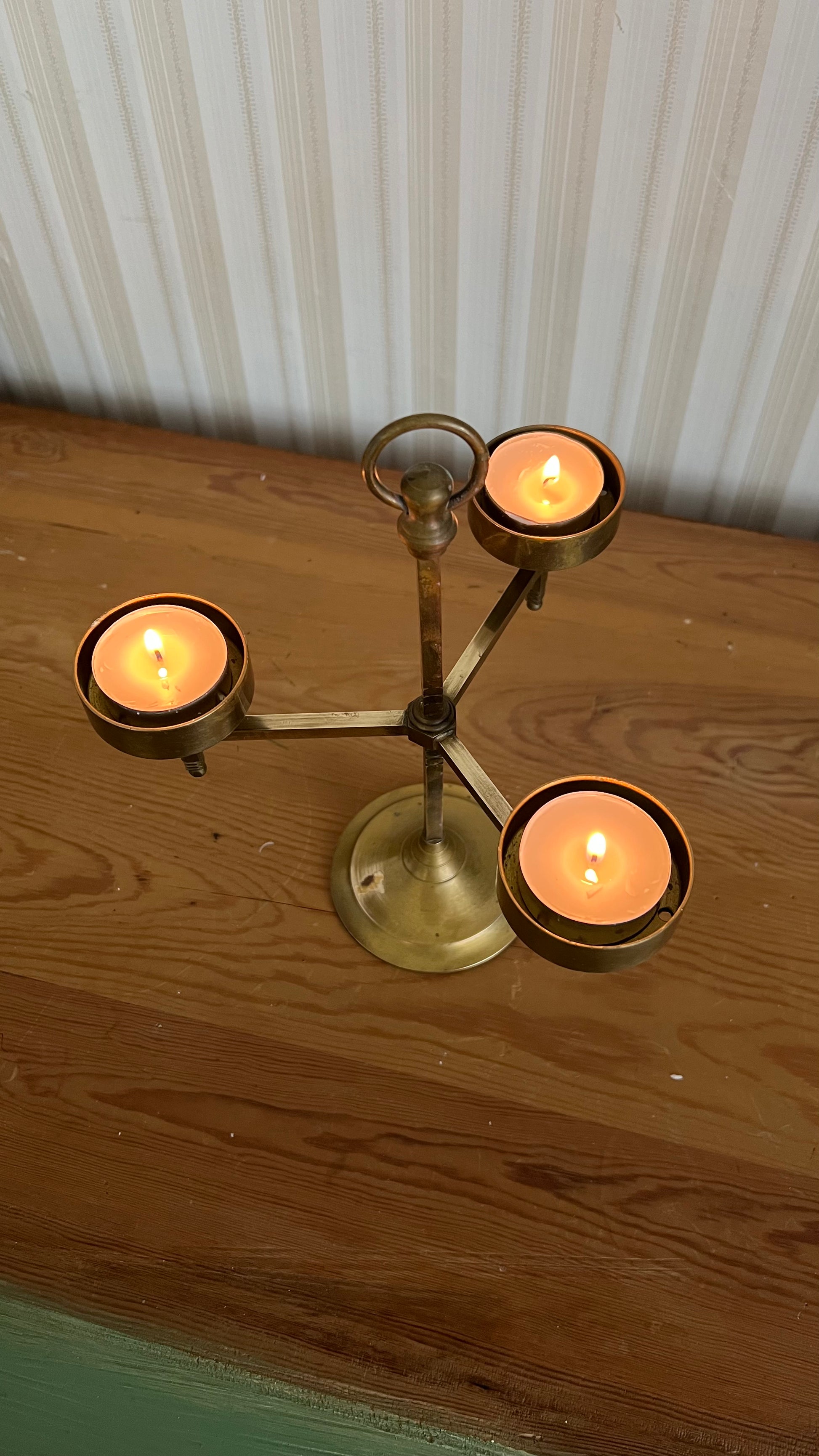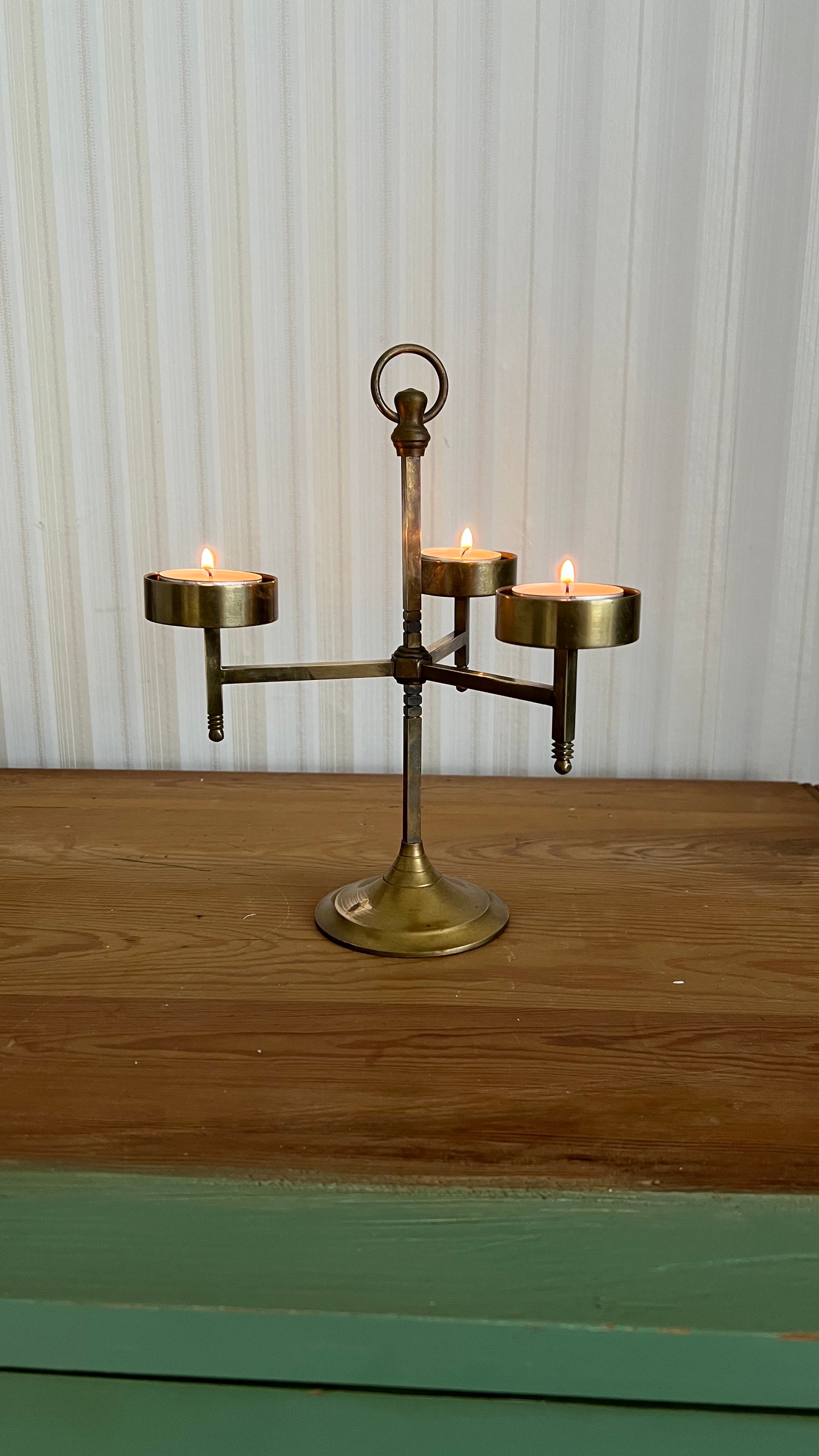 En elegant värmeljushållare i mässing, designad för att hålla tre ljus i en stilfull uppsättning. Lätt att flytta och är perfekt för både vardag och festliga tillfällen. Naturligt patinerad.