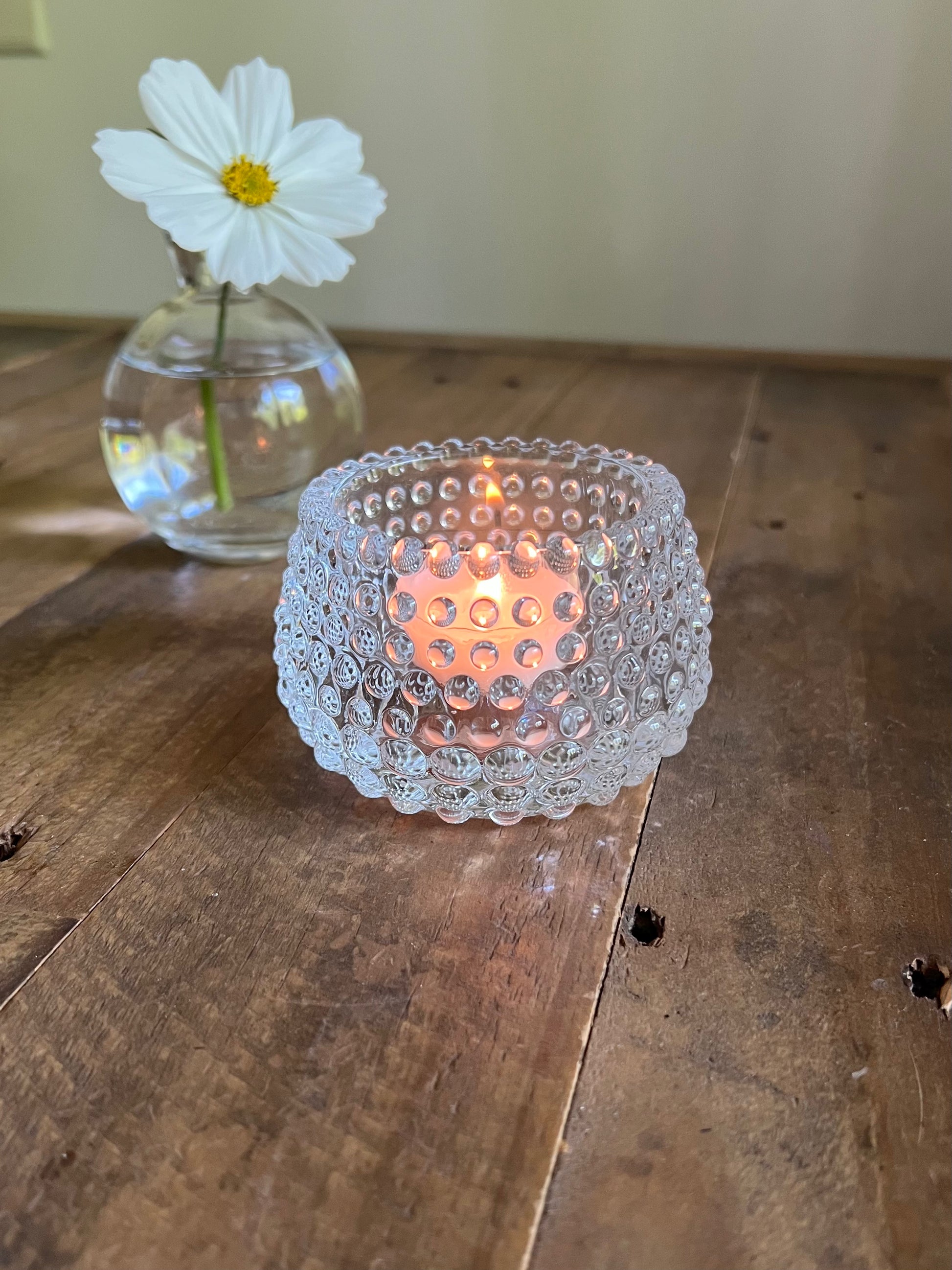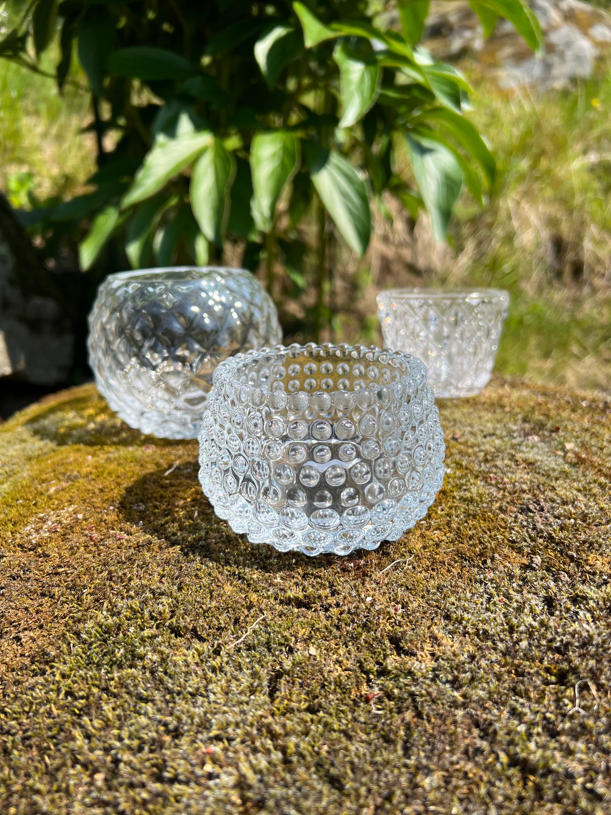 En mindre värmeljushållare i glas som står stadigt tack vare sin tyngd.